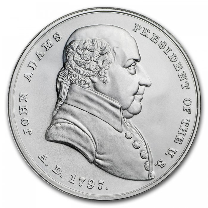 The is the first issue of the Presidential Silver Medals program provided by The United States Mint. This Silver Medal honors John Adams, our second President of the United States of America. Adams succeeded George Washington after his service as Vice President to Washington. Before his election as President, Adams was a leading member of the Continental Congress, was elemental in drafting the Declaration of Independence, and was revered as a prominent political author.