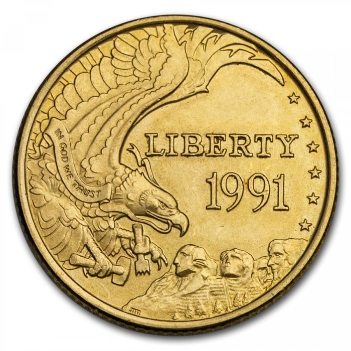 This $5 Gold coin was issued to celebrate the 50th anniversary of the Mount Rushmore National Monument.