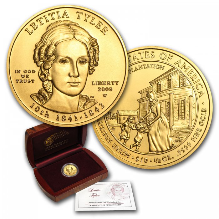 Mintage of just 3,240 coins! First Ladies have made many contributions to their husband's presidency. This First Spouse coin pays tribute to the accomplishments of the beloved Letitia Tyler.