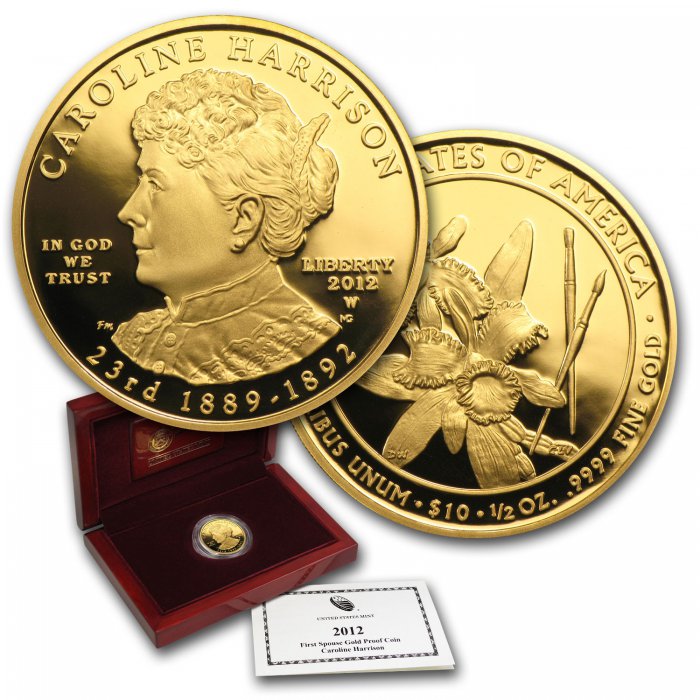 First Ladies have made many contributions to their husband's presidency. This First Spouse coin has a Proof finish and pays tribute to the accomplishments of Caroline Harrison.