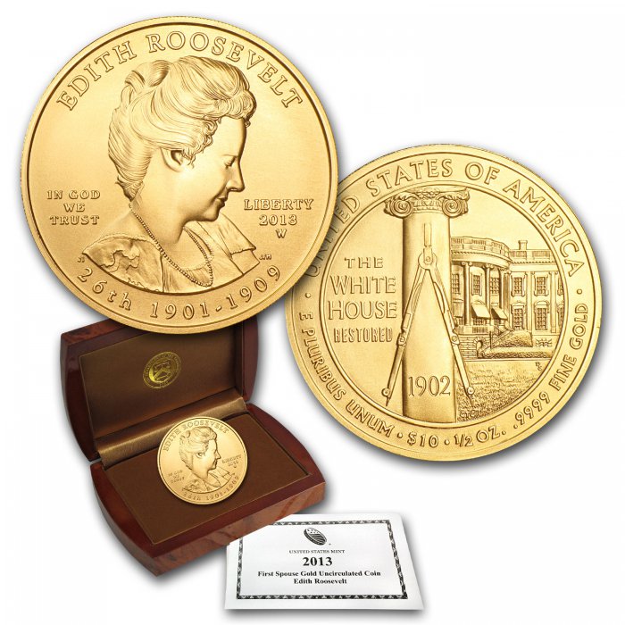 First Ladies have made many contributions to their husband's presidency. This First Spouse coin pays tribute to the accomplishments of the beloved Edith Roosevelt.