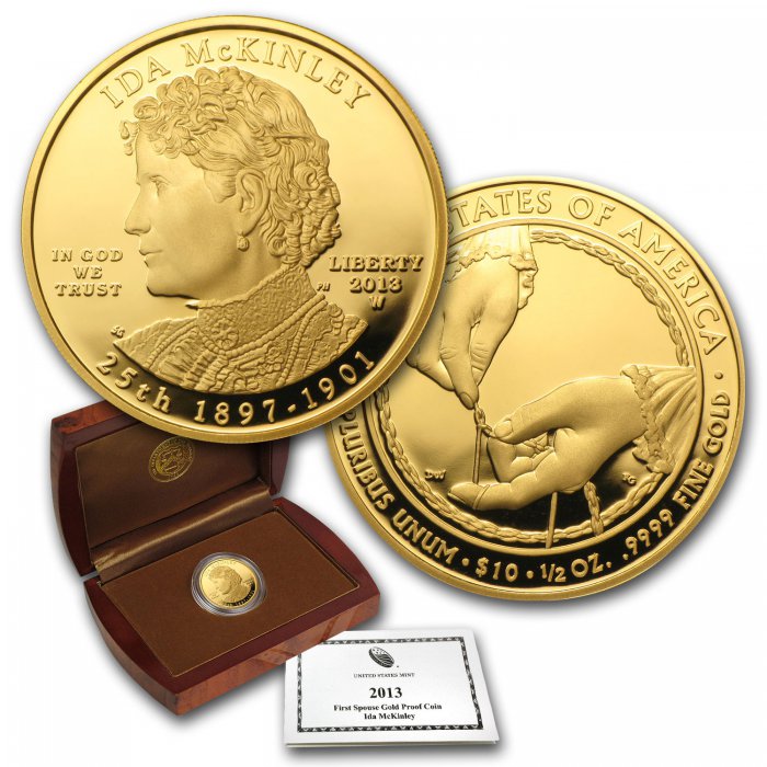 This Proof First Spouse Gold coin pays tribute to the accomplishments of Ida McKinley. Each coin contains 1/2 oz of .9999 fine Gold, making their intrinsic value just as exquisite as the design and production.