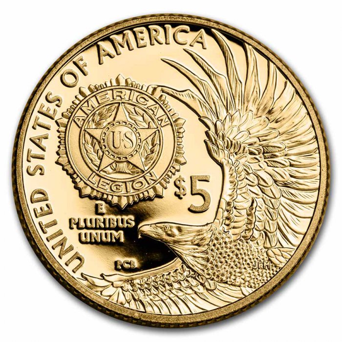 This $5 Gold coin features a design celebrating the 100th anniversary of the founding of the American Legion, an American organization dedicated to service to veterans and service members and their communities.