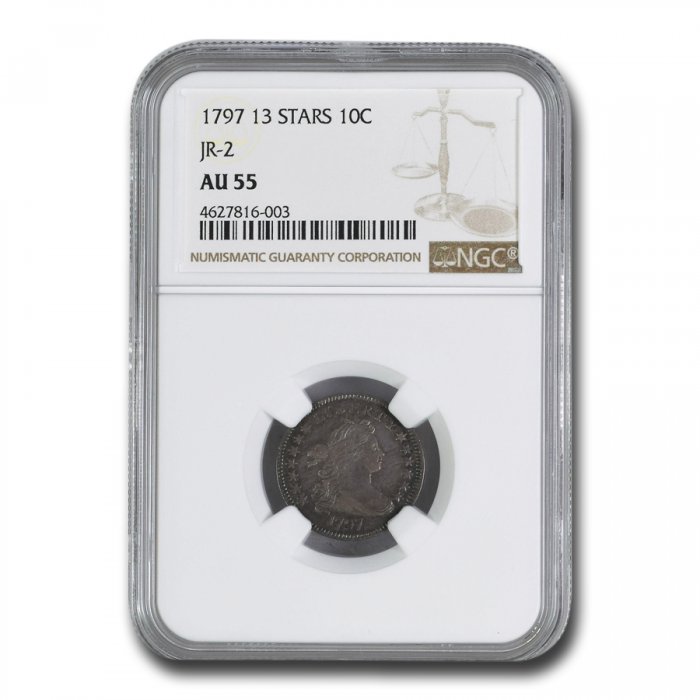 This 1797 Draped Bust Dime (13 Stars, JR-2) has been certified as AU-55 by NGC, one of the top two coin grading services.