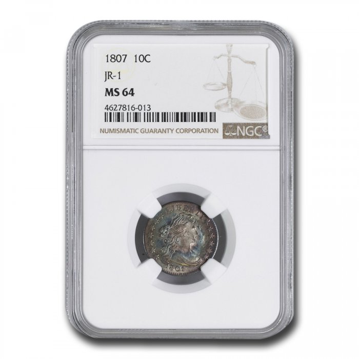 This 1807 Draped Bust Dime (JR-1) has been certified as MS-64 by NGC, one of the top two coin grading services.