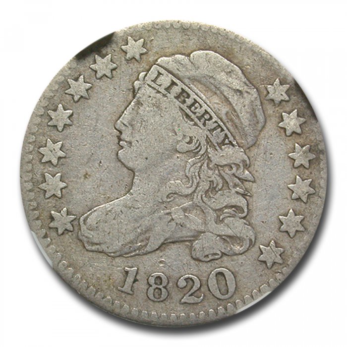 This 1820 Capped Bust Dime has been certified as VF-25 by NGC, one of the top two coin grading services. This coin has a population of only 42 coins!