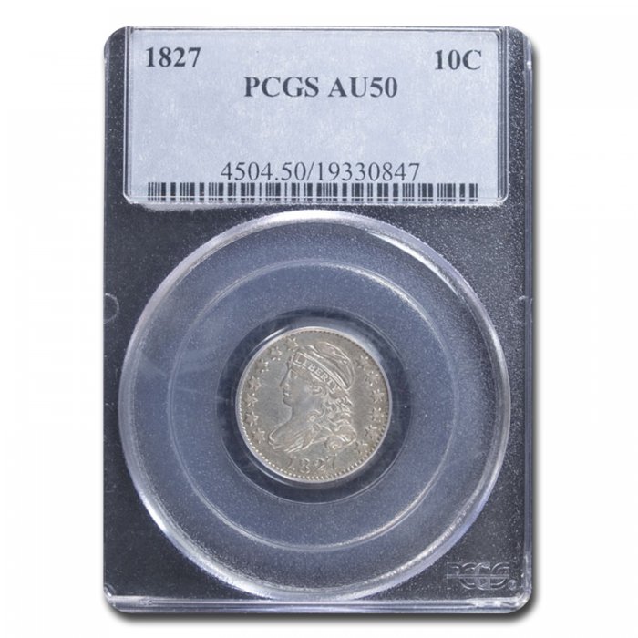 Only $749.00 per coin This 1827 Capped Bust Dime has been certified as AU-50 by PCGS, one of the top two coin grading services. This coin has a population of only 22 coins!