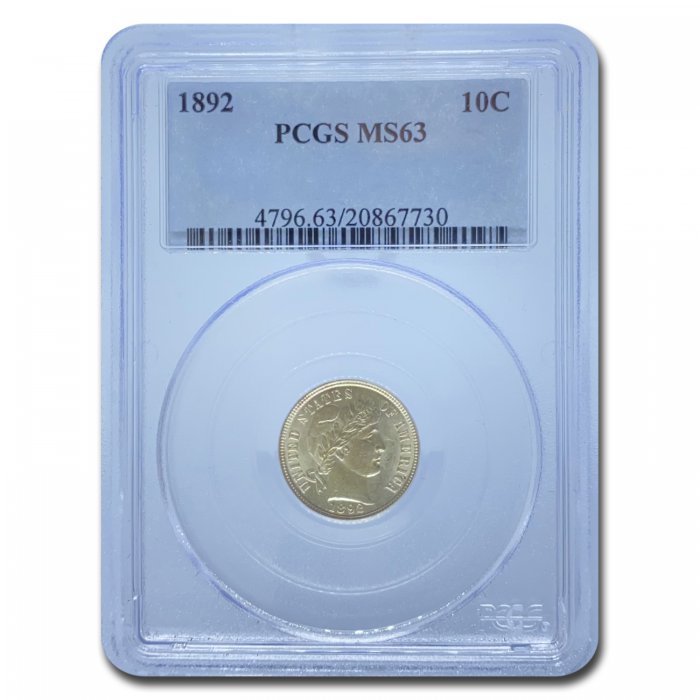 This 1892 Barber Dime has been certified as MS-63 by PCGS, one of the top two coin grading services. This highly collectible coin is a great addition to any numismatic collection!