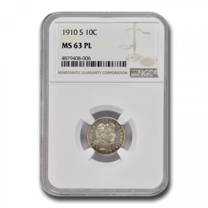 Only $2,239.00 per coin This 1910-S Barber Dime has been certified as MS-63 (PL) by NGC, one of the top two coin grading services. This coin has a population of only 1 coin!