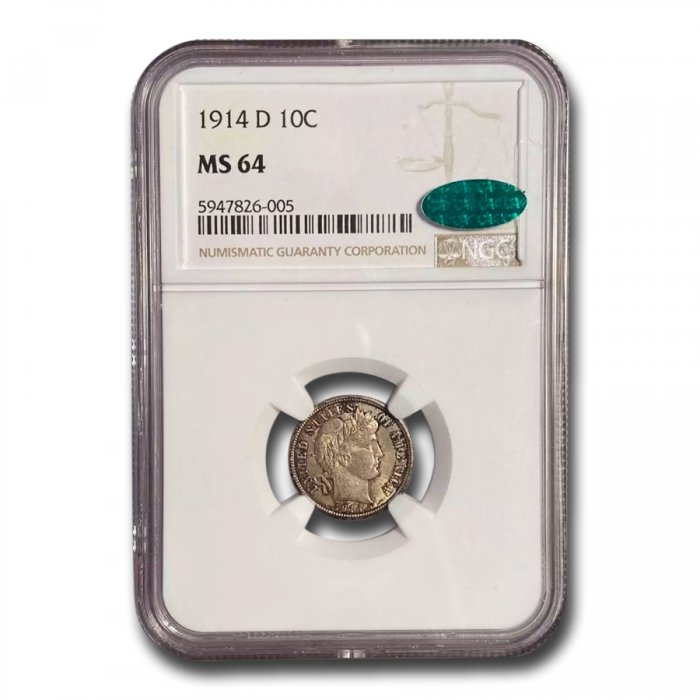 This 1914-D Barber Dime has been certified as MS-64 by NGC, one of the top two coin grading services. This coin has a population of only 114 coins!