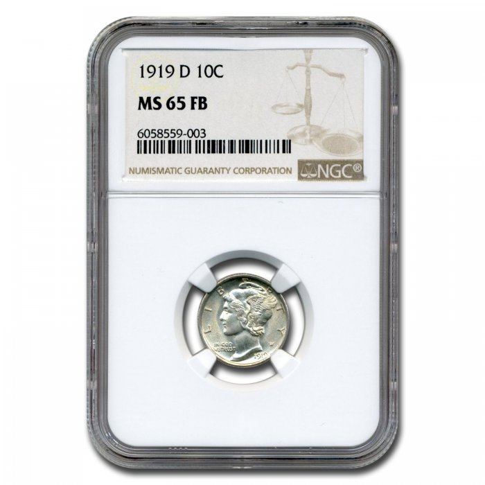 This 1919-D Mercury Dime has been certified as MS-65 (FB) by NGC, one of the top two coin grading services. This coin has a population of only 7 coins!
