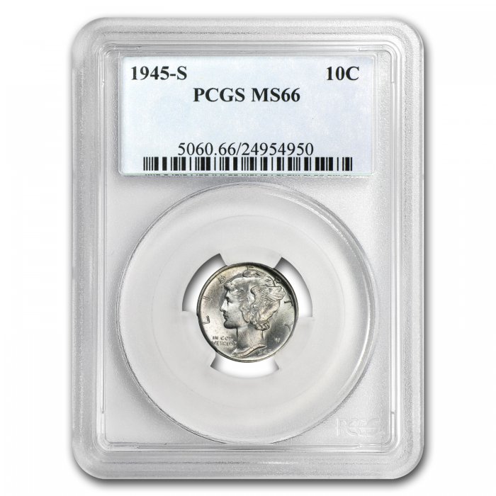 This 1945-S Mercury Dime has been certified as MS-66 by PCGS, one of the top two coin grading services. This highly collectible coin is a great addition to any numismatic collection!