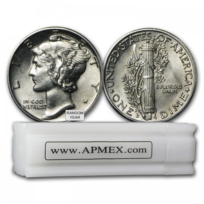 Each roll contains 50 Brilliant Uncirculated Mercury Dimes. These dimes are mostly from the 1940s with an occasional 1930s date.