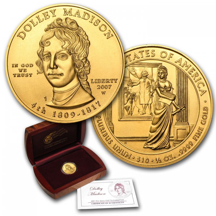 The First Spouse series were the U.S. Mint's first 1/2 oz Gold coins to contain .9999 fine Gold. The low mintages add further collectible appeal on top of the unique designs. This fourth overall release celebrates Dolley Madison, wife of James Madison.