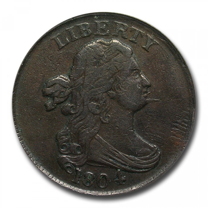This 1804 Draped Bust Half Cent (Spiked Chin) has been certified as XF-40 by PCGS, one of the top two coin grading services. This coin has a population of only 104 coins!