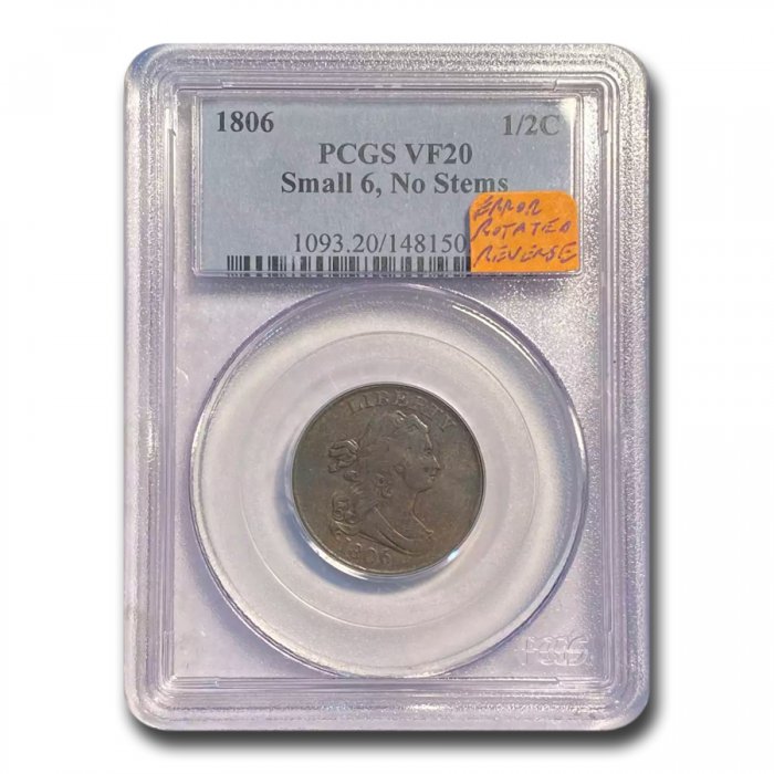 This 1806 Half Cent has been certified as VF-20 (Brown) by PCGS, one of the top two coin grading services. This coin has a population of only 40 coins!