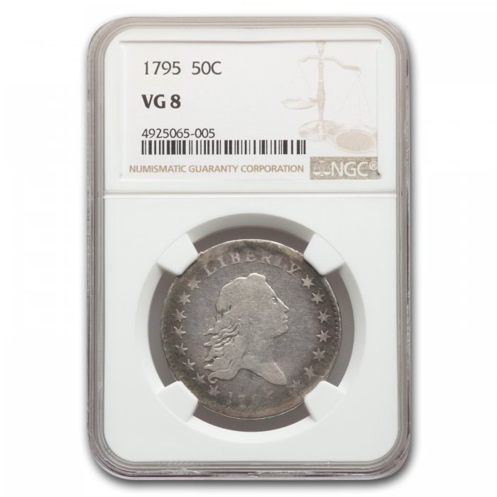 Only $1,795.00 per coin This 1795 Flowing Hair Half Dollar has been certified as VG-8 by NGC, one of the top two coin grading services. This coin has a population of only 297 coins! This is an affordable coin of this tough to find date.