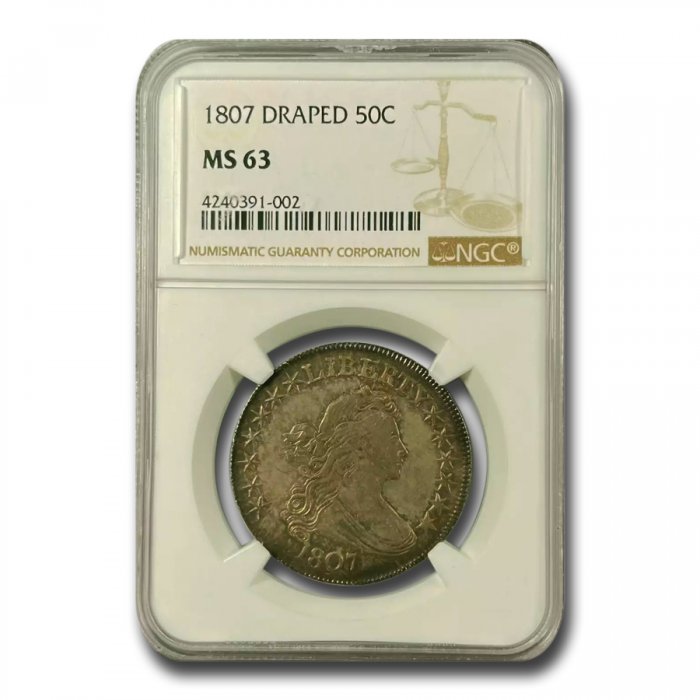This 1807 Draped Bust Half Dollar has been certified as MS-63 by NGC, one of the top two coin grading services.