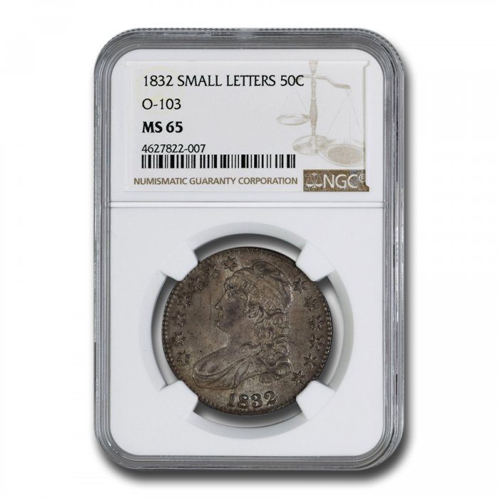 This 1832 Capped Bust Half Dollar (O-103) has been certified as MS-65 by NGC, one of the top two coin grading services.