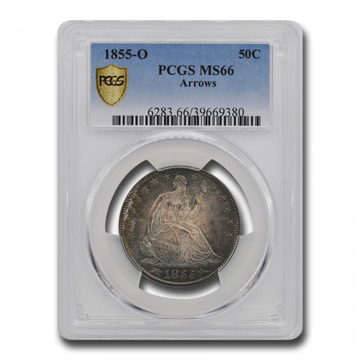 This 1855-O Liberty Seated Half Dollar (Arrows) has been certified as MS-66 by PCGS, one of the top two coin grading services. This coin has a population of only 7 coins!