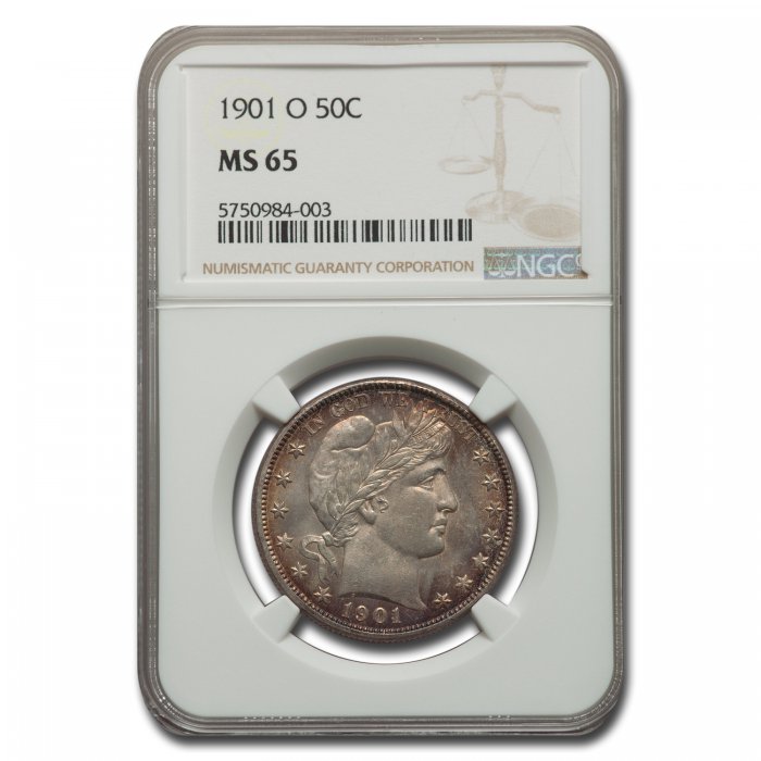 This 1901-O Barber Half Dollar has been certified as MS-65 by NGC, one of the top two coin grading services. This coin has a population of only 5 coins!
