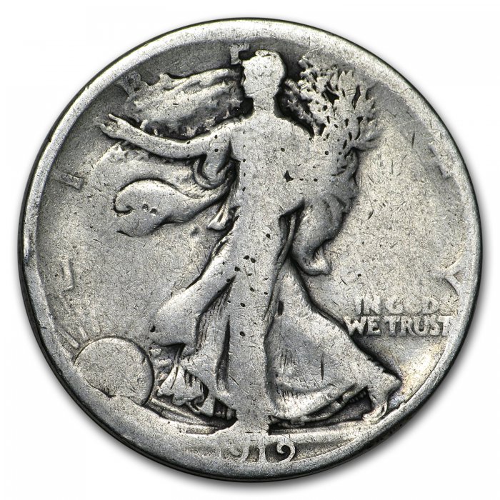 Walking Liberty Half Dollars are some of the most popular coins amongst collectors, and their beloved design was imitated for the Silver American Eagle. This example shows Almost Good wear, though the design is still visible.