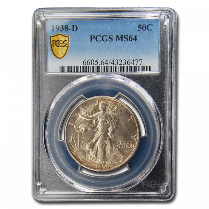 This 1938-D Walking Liberty Half Dollar has been certified as MS-64 by PCGS, one of the top two coin grading services. This highly collectible coin is a great addition to any numismatic collection!