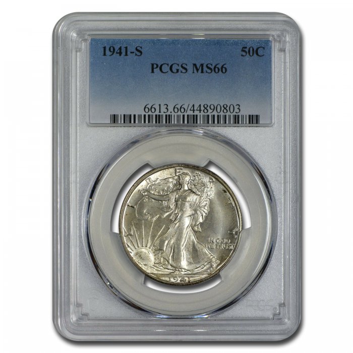 Only $1,039.00 per coin This 1941-S Walking Liberty Half Dollar has been certified as MS-66 by PCGS, one of the top two coin grading services. This highly collectible coin is a great addition to any numismatic collection.