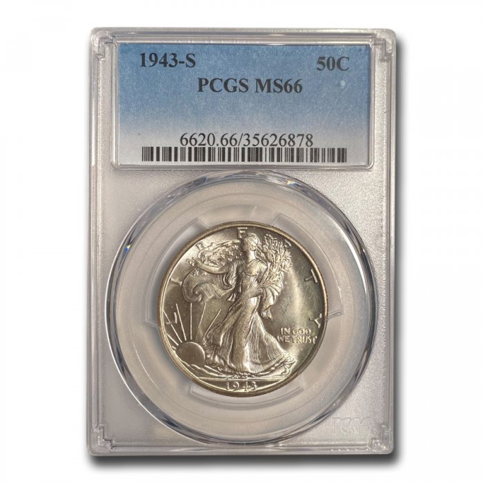 Bright and flashy surfaces display just trivial ticks. This 1943-S Walking Liberty Half Dollar has been graded and guaranteed by PCGS as being in Mint State-66 condition.