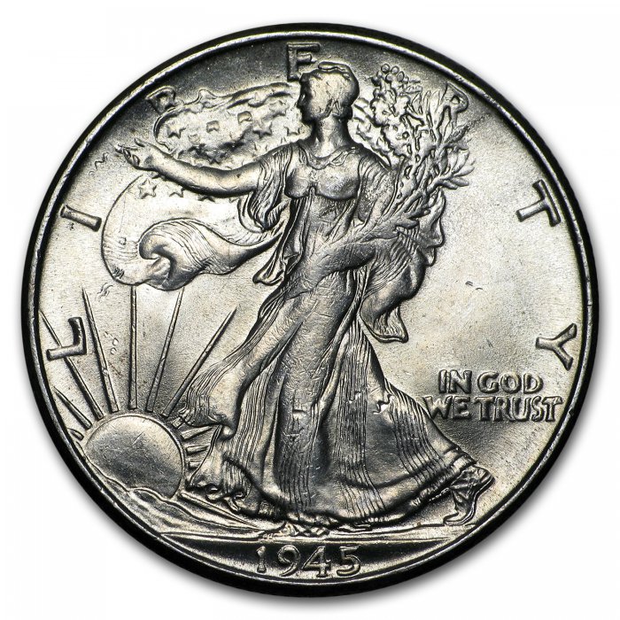 This 1945 Walking Liberty Half Dollar is in Brilliant Uncirculated condition.