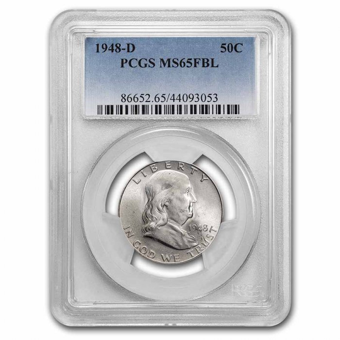 This 1948-D Franklin Half Dollar has been certified as MS-65 (FB) by PCGS, one of the top two coin grading services. This highly collectible coin is a great addition to any numismatic collection!
