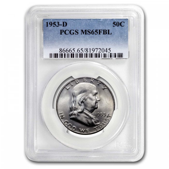 This 1953-D Franklin Half Dollar has been certified as MS-65 (FB) by PCGS, one of the top two coin grading services. This highly collectible coin is a great addition to any numismatic collection!
