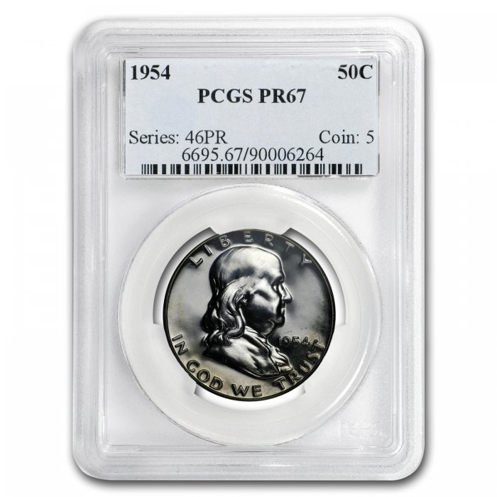 This 1954 Franklin Half Dollar has been certified as PR-67 by PCGS, one of the top two coin grading services. This highly collectible coin is a great addition to any numismatic collection!