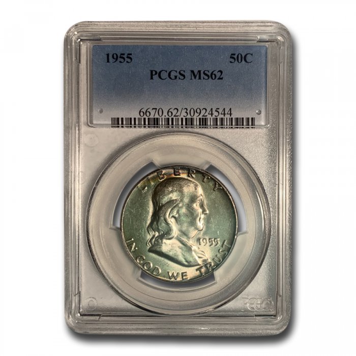 Only $489.99 per coin This 1955 Franklin Half Dollar (Beautiful Toning) has been certified as MS-62 by PCGS, one of the top two coin grading services. This coin has a population of only 112 coins!