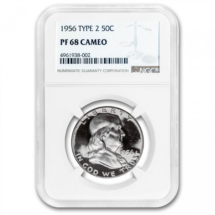 Only $189.99 per coin This Type-II 1956 Franklin Half Dollar has been certified as PF-68 Cameo by NGC, one of the top two coin grading services. This coin has a population of only 108 coins!