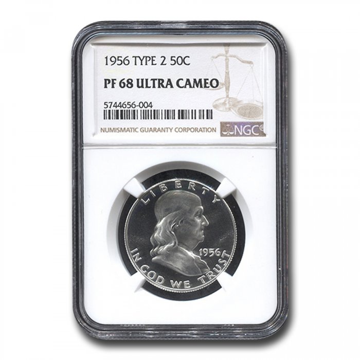 Only $399.99 per coin This 1956 Franklin Half Dollar Type-II has been certified as PF-68 UCAM by NGC, one of the top two coin grading services. This highly collectible coin is a great addition to any numismatic collection.