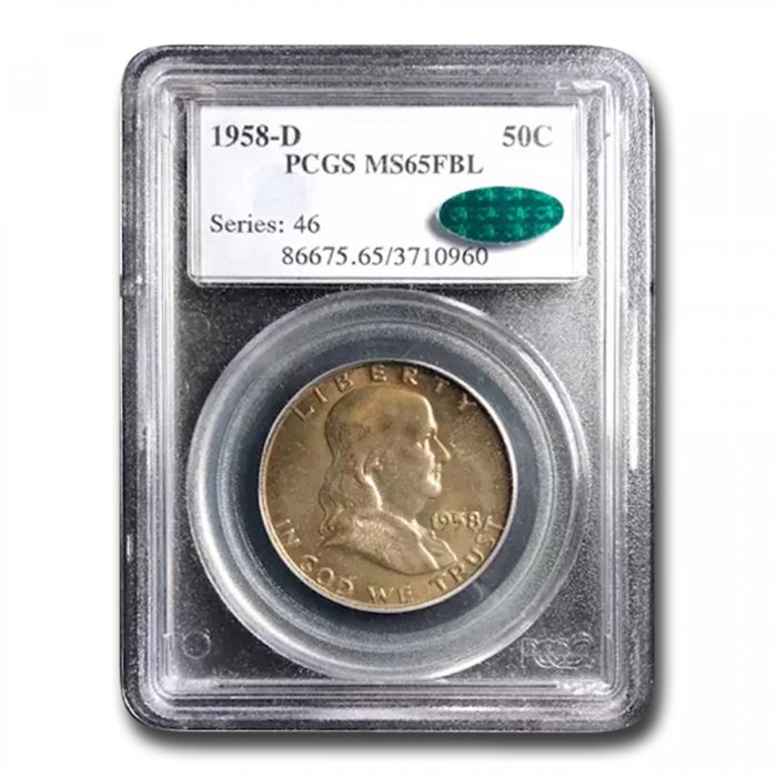 Only $519.00 per coin This 1958-D Franklin Half Dollar has been certified as MS-65 (FBL) by PCGS, one of the top two coin grading services. This highly collectible coin is a great addition to any numismatic collection!