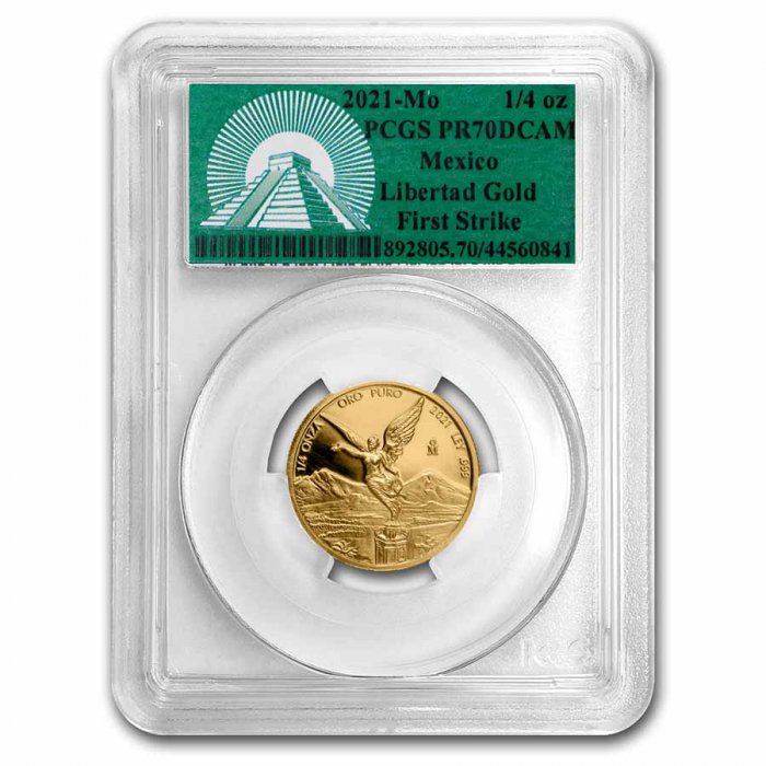 - Coin is encapsulated in a PCGS holder, certifying the Proof-70 DCAM First Strike grade of the coin. Also included on the slab is our exclusive green label.