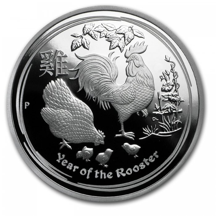 - Reverse: Features a rooster, a hen, and three chicks standing amongst bamboo foliage and flowers. This beautiful lunar design also incorporates the Chinese character for "Rooster", the inscription "Year of the Rooster", and The Perth Mint's traditional "P" mint mark.