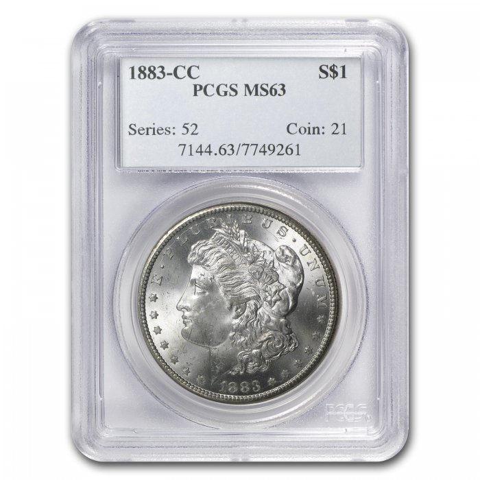 The Morgan Silver Dollar is the world's most popular Silver dollar for its timeless design of Liberty. This 1883-CC Morgan Dollar has been certified as an MS-63 by PCGS, one of the top coin grading services.
