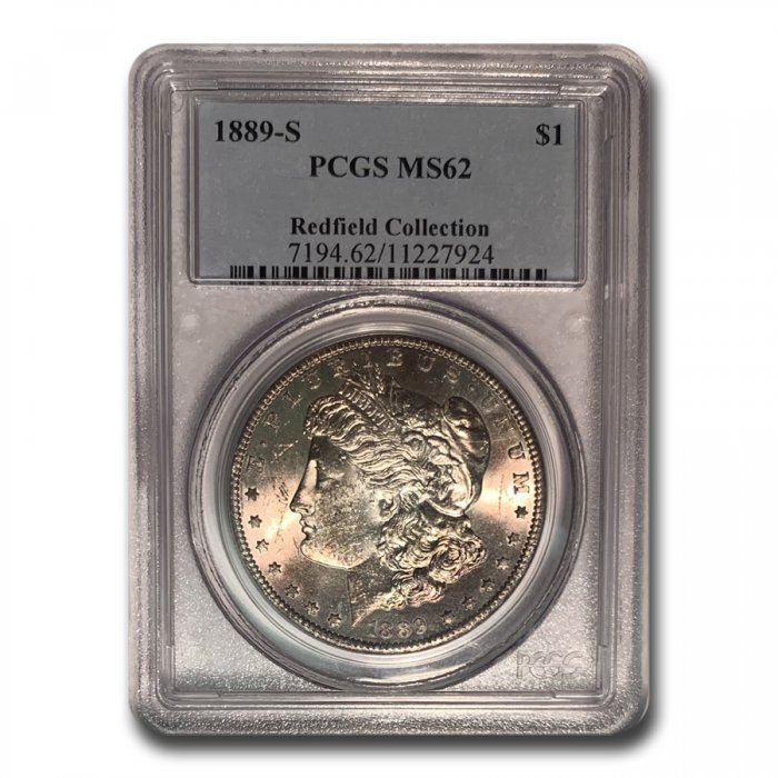 This 1889-S Morgan Dollar (Redfield Hoard) has been certified as MS-62 by PCGS, one of the top two coin grading services. This highly collectible coin is a great addition to any numismatic collection!