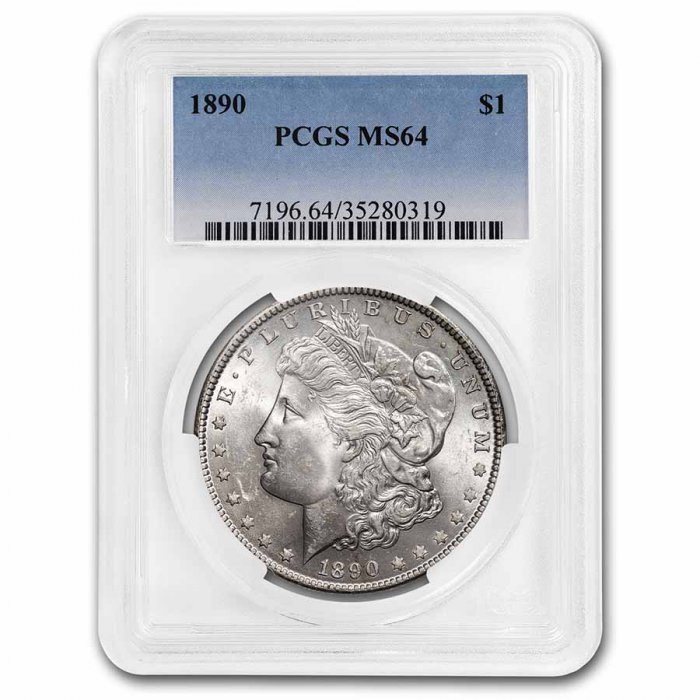 The Morgan Silver Dollar features a classic design of Liberty and is the most popular Silver dollar in the world. This 1890 Morgan Dollar has been graded and guaranteed by PCGS as being MS-64.