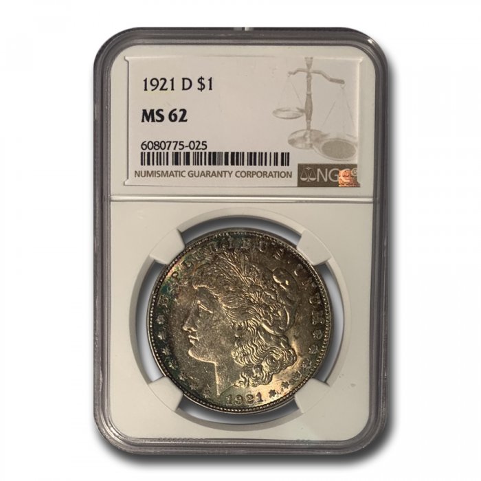 Only $549.00 per coin This 1921-D Morgan Dollar (Beautiful Toning) has been certified as MS-62 by NGC, one of the top two coin grading services. This highly collectible coin is a great addition to any numismatic collection!