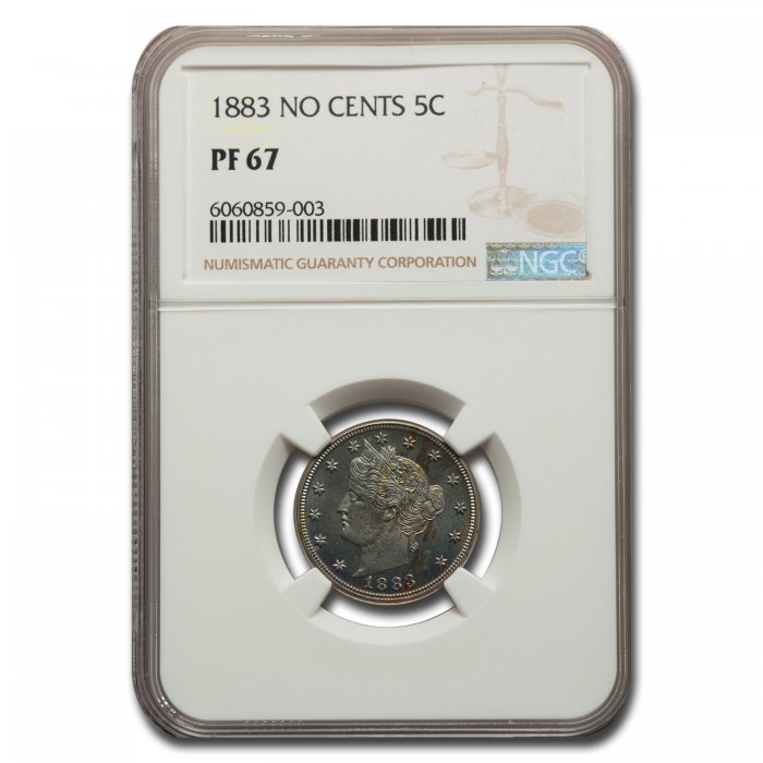 This 1883 Liberty Head V Nickel (No Cents) has been certified as PF-67 by NGC, one of the top two coin grading services. This coin has a population of only 19 coins!