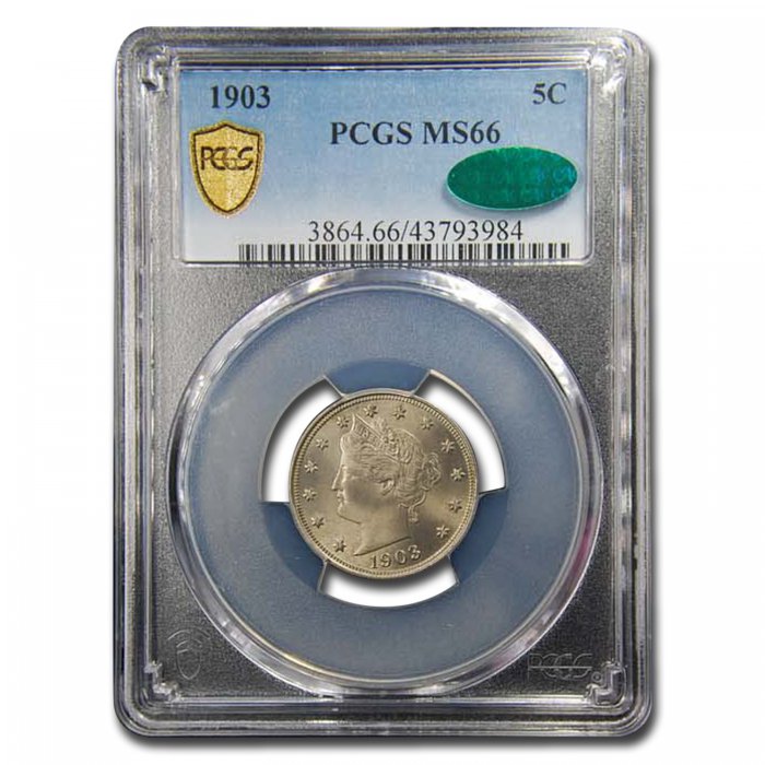 This 1903 Liberty Head V Nickel has been certified as MS-66 by PCGS, one of the top two coin grading services. This coin has a population of only 119 coins!