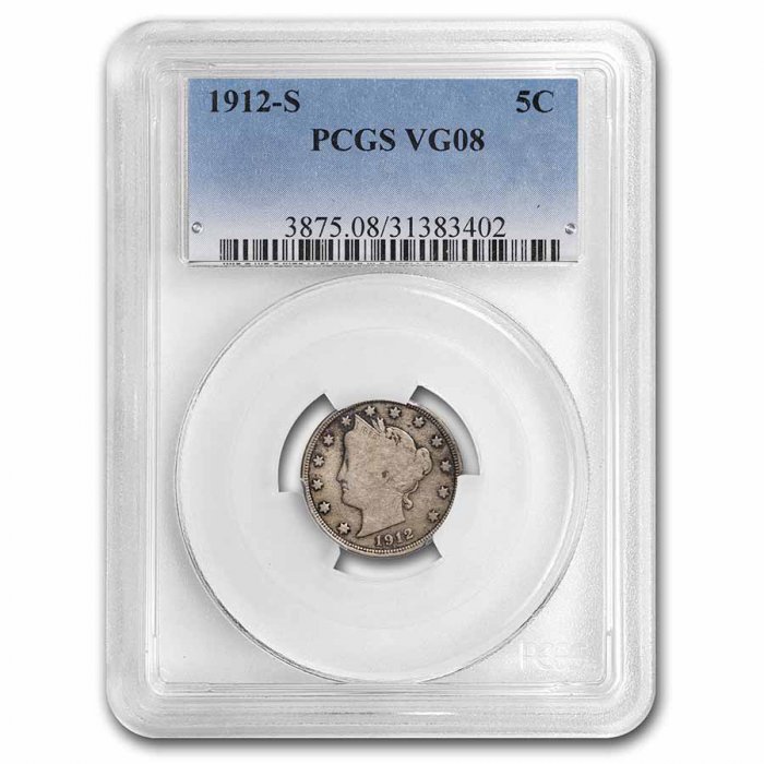 This 1912-S Liberty Head V Nickel has been certified as VG-8 by PCGS, one of the top two coin grading services. This highly collectible coin is a great addition to any numismatic collection!