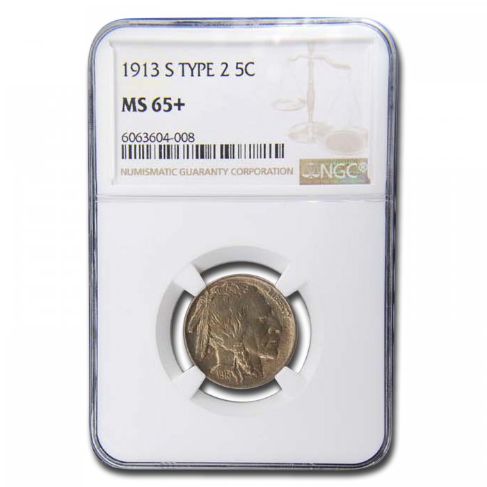 This 1913-S Buffalo Nickel Type-II has been certified as MS-65+ by NGC, one of the top two coin grading services. This coin has a population of only 3 coins!