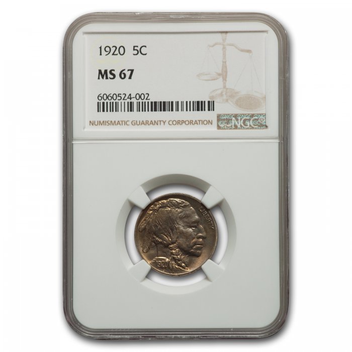 This 1920 Buffalo Nickel has been certified as MS-67 by NGC, one of the top two coin grading services. This coin has a population of only 7 coins!
