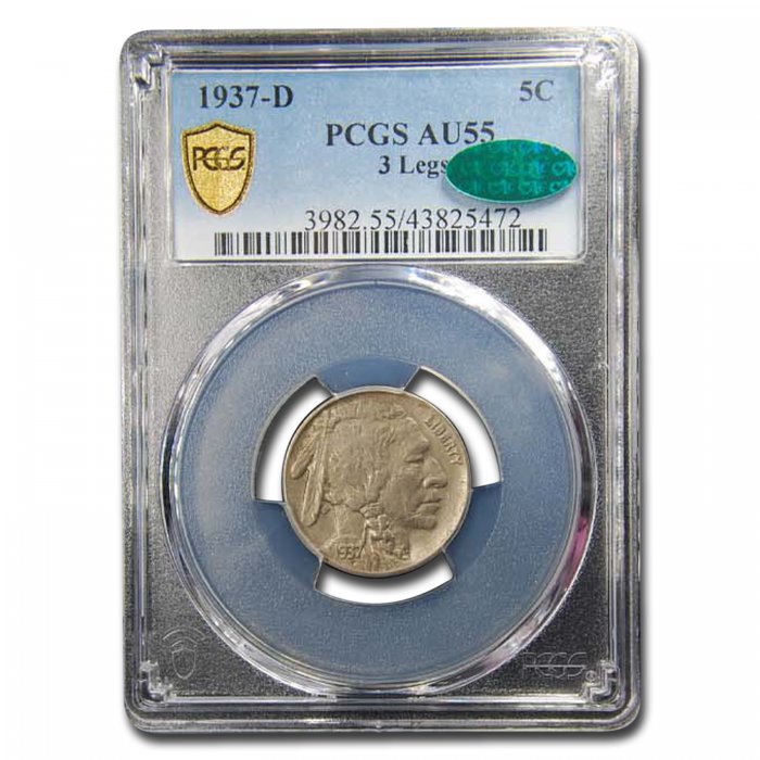 This 1937-D 3 Legged Buffalo Nickel has been certified as AU-55 by PCGS, one of the top two coin grading services. This highly collectible coin is a great addition to any numismatic collection!