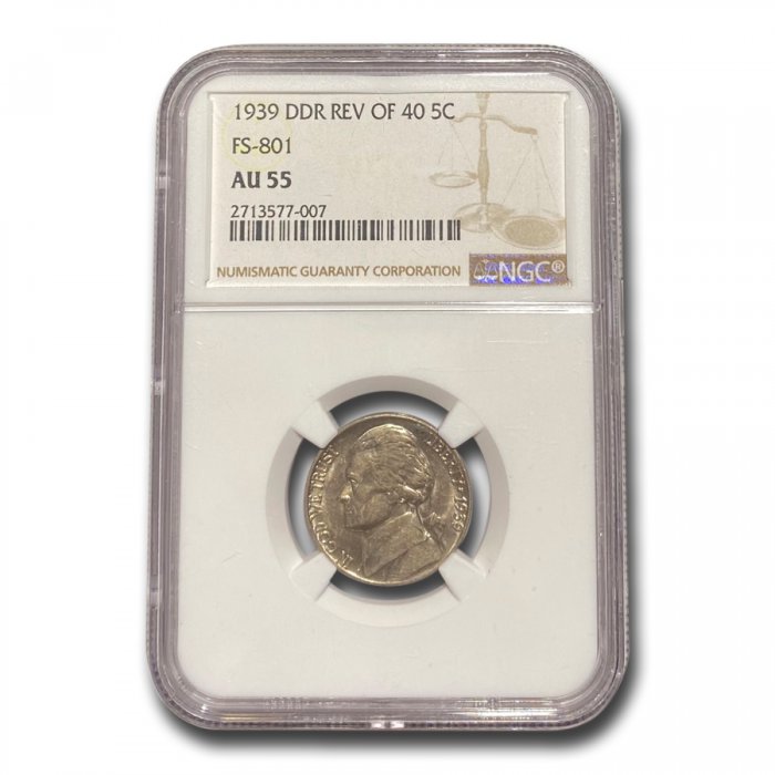 This 1939 Jefferson Nickel (DDR, Rev of 40, FS-801) has been certified as AU-55 by NGC, one of the top two coin grading services. This coin has a population of only 50 coins!